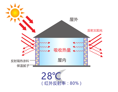 反射隔熱涂料是由基料、熱反射顏料、填料和助劑等組成。通過高效反射太陽光來達到隔熱目的